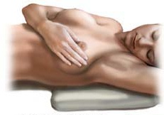b- Acostate de espaldas. Para palpar la mama derecha, coloca una almohada bajo tu hombro derecho y el brazo del mismo lado detrás de la nuca. Con la yema de los dedos centrales de la mano izquierda palpa firmemente la mama derecha.